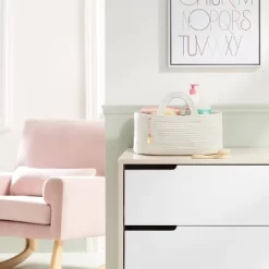A functional piece that coordinates with nursery decor, the Coiled Rope Diaper Caddy with Dividers from cloud island™ brings easy organization to your space. Featuring an open-top design for easy access to the caddy’s contents, this diaper caddy comes with a removable inner section with three compartments to stash their diapers, wipes, powder, rash creams or other necessities close at hand. Plus, the two side tote handles make it easy to carry from one room to another. Featuring a coil construction in a cream hue, it will bring a touch of texture and style to your changing station.