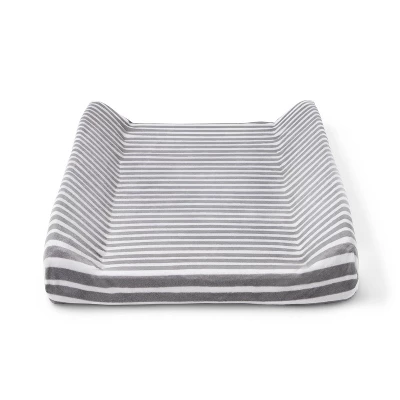 - Skirt and changing pad cover feature gray and white geometric patterns
