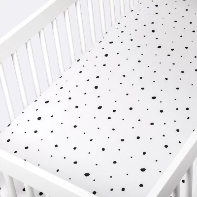 This Fitted Crib Sheet from cloud island™ fits standard crib and toddler beds. Made from 100% cotton, this standard crib sheet fits a six-inch mattress, and it’s designed with an all-around elastic for securing over the corners of their crib mattress. Adorned with black dots on a white background, this printed fitted crib sheet adds a playful look to your nursery decor, and is easy to coordinate with a variety of themes and color palettes.