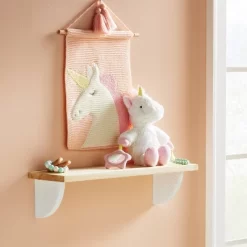 Revamp and declutter a kid’s room or nursery with this Half Moon Dots and Dash Pattern Decorative Wall Shelf from cloud island™. This wall shelf features a single solid natural wood shelf with a decorative dot and dash pattern on white wooden brackets. It can easily be mounted on any wall to provide a sleek platform to display framed photos, stuffed animals, small toys and more.